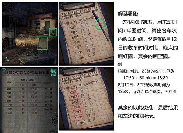 5、从车门离开公交车,点击值班室旁的椅子,拿到【蓝圆珠笔】。根据公交运行时刻表的时间信息,用【红圆珠笔】和【蓝圆珠笔】在收车时间统计表上画上对应颜色的圈,打开值班室的门。