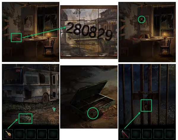 8、点击桌上的电话,拨打拼图上的号码(电话惊声小高能),拿到绑在吊扇上的【钥匙】。用【钥匙】打开地上的箱子(水中倒影小高能),箱子里拿到【剪刀钳】,用【剪刀钳】剪断铁门上的锁链。