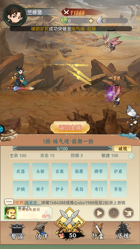 2、点击中间的战斗按钮,玩家可前往野外进行历练;