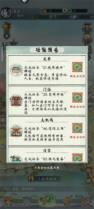 4、三大副本(常规,剧情,秘境)可以解锁,加入了全自动挂机的游戏玩法,没有任何繁琐的操作体验,轻松的组合各种的功法,学道法,做任务,访禁地,闭关做修炼,游戏更加有趣。