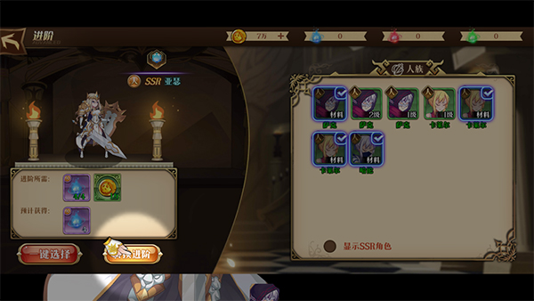 同时英雄属性提升到一定阶段时等级达到上限,这时候需要进行英雄进阶来达到下一个阶段,突破等级上限,英雄进阶需要消耗自身本体的卡牌、或者是消耗对应种族的元素值以及金币来进行进阶。