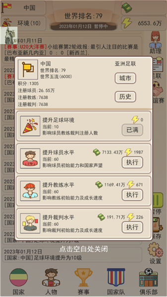 1、在国家界面下,我们可以随心所欲的对一系列数据进行提升操作,包括了:足球环境、球员水平等等,我们可以自由点击提升,看看右上角是无限体力哟。