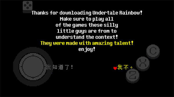 地域传说彩虹是一款像素风的角色扮演类游戏,由B站UP主“"C-G_O_A_T”进行的重制版本,其来源是外网的同名游戏。游戏中拥有着详细的新手教程,让对本游戏感兴趣的玩家都能够轻松的上手。在内容上,采用了剧情推进的形式,玩家将通过悬浮在屏幕中的虚拟按键进行角色的控制,根据对话做出不同的选择,还会解锁不一样的游戏结局,搭配那恰到好处的背景音乐,使得游戏氛围更加的浓烈。