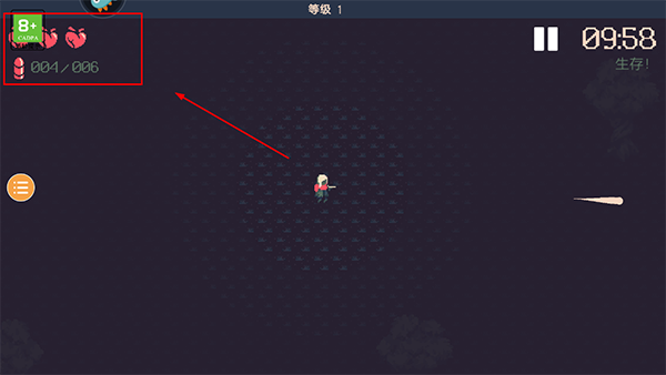 4、游戏界面右上方为子弹状态(子弹数量为0的时候,需要根据武器填装时间等待的子弹填满),血量;