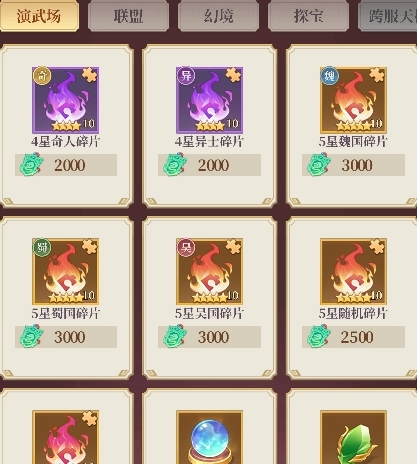演武币可以前往商店兑换资源。如果只想开武将,前期建议买观星灵珠,开出5星的概率还是挺高的,比较划算。如果是想凑狗粮或指定武将,可定向购买武将碎片。