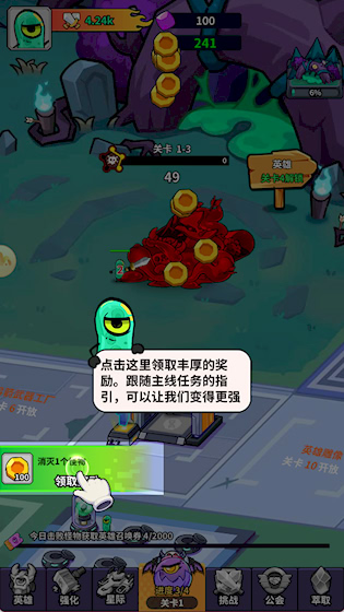1、英雄养成:通过战斗与宝箱获取材料,升级英雄等级、技能与装备,打造专属战斗小队。
