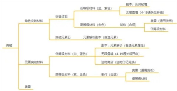 阶段性的突破则需要角色突破材料,与角色所对应元素的突破材料来完成。其中低等级材料从副本即可大量获得,而高等级材料需要通过低等材料的合成来获取。这些材料的获取途径见下方: