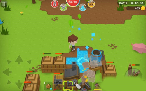 3、活过第一晚,第二天就把净水器做出来,然后需要铁块做铁桶。不然你活不过第三天早上的。净化水的方法,站在水塘边,选中铁桶,然后点右边按钮就会打水。对准净水器打开界面,按住铁桶拖到界面左边那栏,然后会自动净化。取水是两种,玻璃瓶或者铁桶,选中后,下面的【OK】亮了,点下,净化后的水就到铁桶或玻璃瓶中了。4、第三天,一定建出厕所来,不然也会死掉。