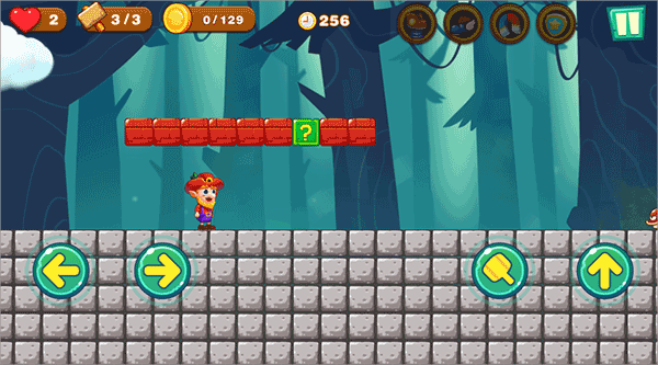 超级大冒险是一款简单休闲的平台跳跃闯关类游戏,采用了2D横版的游戏设定,以可爱的Q版角色为主角进行塑造,将一幅绚丽的动作冒险展现在玩家们的眼前。在玩法上,如同其他平台跳跃游戏一样,采用了双区域控制的设定,玩家只需要控制小人的前后和跳跃,并在合适的时候使用锤子进行攻击即可,上手十分的简单;在关卡内容上,且设定了奇妙丛林、炽热沙海、冰天雪地、热带雨林和黑暗火山五个不同的场景,内置丰富的关卡,在等待你的挑战。