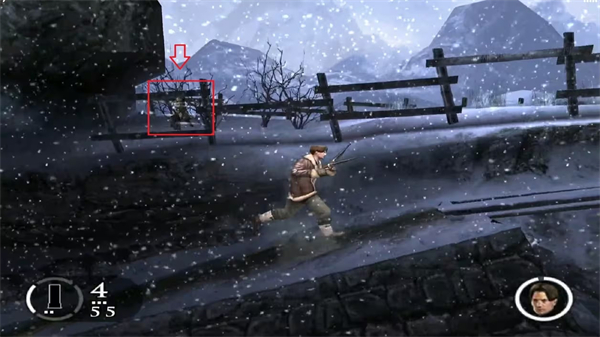 本关场景是在雪山上,往右走,在一座石桥上会刮很大的雪风,小心躲避风前进,另外在桥上不要逗留太久,否则桥会塌陷,一路走到半山腰后会看见堆篝火,干掉这里的2只狼后右边继续上山到山顶,这里左边角落里有收集品,右边干掉几只狼后还会有大量敌人出现,全消灭后右边一大枯树崩塌出现新路,在那爬上去跳到对面,在上面爬到山右边去,看见一个风车样的木塔,全灭这里敌人后调查木塔放下木板再拉上去,消灭几只狼后在右边上面攀着雪山沿右边跳过去,不过期间小心别被落下的石块等物砸到,再下面沿着绳子爬到右边,消灭狼右走摇把手把木门转开来到一山寨!
