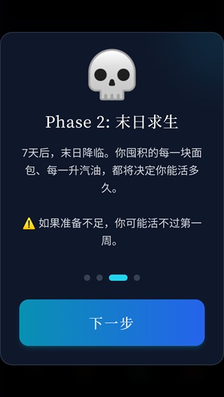 核心挑战:7天后末世降临,秩序崩塌,你囤积的每一块面包、每一升汽油都将决定你能活多久。