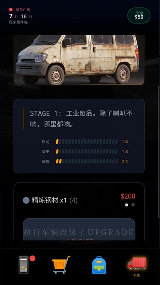 改装优先级:先用精炼钢材提升装甲和载货能力,再逐步升级引擎和加装防御设施,将面包车打造成移动堡垒。