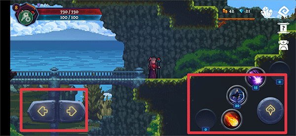 1、进入游戏后,利用左下角左右按钮操控角色的移动,右边向上按钮为跳跃,其他按钮分别为角色的技能