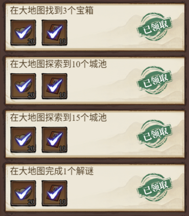 -多进城池:随着剧情主线前往一个又一个城池,或者在大地图闲逛,看到城池就点进去,逛满10个、15个自动完成。