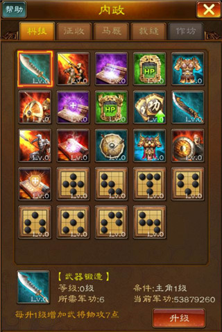 目前版本有26种科技可供玩家培养,升级科技需要消耗军功,升级科技可获取对应的属性或特殊效果。