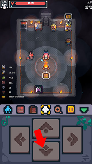 2、想要切换角色时,移动至篝火处,再次点击朝向篝火的方向键即可进入角色选择和强化界面