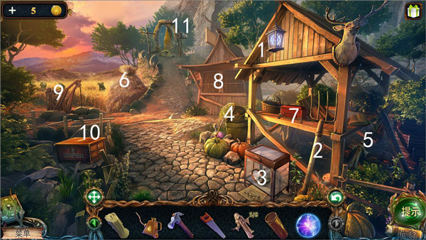 15、农具间内,图中1获得能量球;2处获得大叉,对6处使用大叉获得第六块和尚雕塑;3处点击阅读得到线索哈芬斯,4处得到捕虫网,5处得到第七块和尚雕塑。