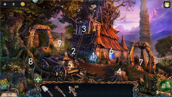 8、图中1处获得锤子;2处获得线索五个世界的堡垒,左入口到达生命之湖,点击人鱼触发剧情得到提示。