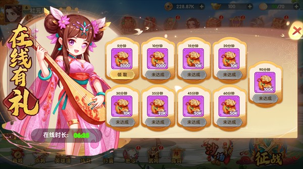 挂在线时长就能领铜钱,从5分钟到90分钟梯度奖励,累计可领200K+铜钱,是前期核心资源。