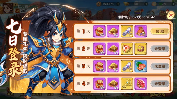 第1天就能领10K铜钱、抽卡卷等等,后续还送S级碎片、金钥匙等,7天领完能攒一大波启动资源。