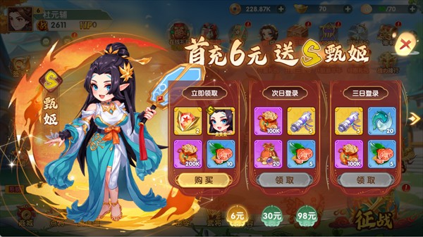 6元实际花费,直接送S级武将甄姬+铜钱+高级食材+升星晶石,是前期最划算的首充,能快速提升战力解锁更多玩法。