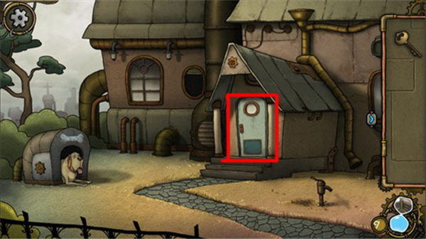 2、我们可以看到道具栏中有一把钥匙,然后点击大门,走到门口。
