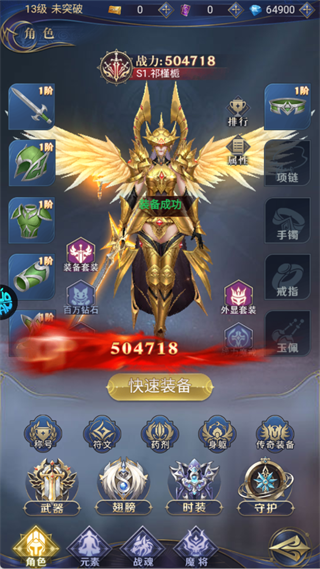 一键装备:在角色的界面点击「快速装备」,一键穿上所有掉落装备,瞬间提升基础战力。