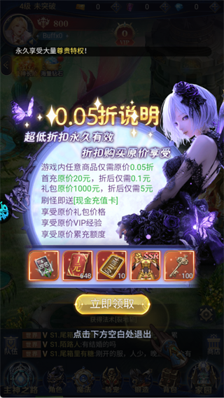 核心福利:游戏内所有商品永久 0.05 折,首充 20 元仅需 0.1 元,千元礼包仅需 5 元,还能享受原价 VIP 经验和累充额度。