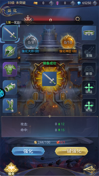优先强化:选择武器、项链等输出向装备进行强化,优先提升攻击、命中属性。