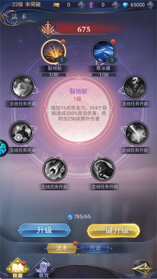 核心技能:优先升级「裂地斩」「寒冰爆」等已解锁的主动技能,提升 AOE 伤害和清怪效率。