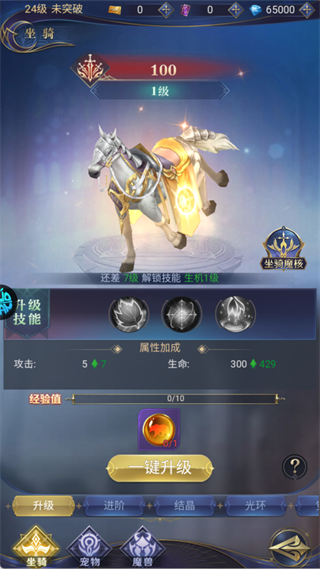 等级提升:消耗坐骑经验道具,点击「一键升级」提升坐骑等级,直接增加攻击、生命等核心属性。