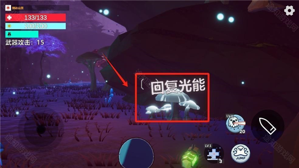 3、若要快速补充光能,主动靠近场景中亮度更高的发光点,借助该区域的强光实现光能的快速回充;能消耗自身储备的气能,长按跳跃键触发快速滑行的移动效果,提升跑图效率或躲避敌人攻击。需要注意的是,一旦操控的光莱姆血量降至零,本局游戏将直接判定失败。