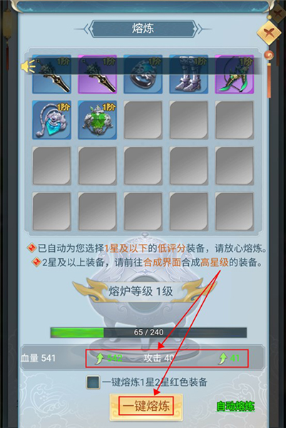 4、对于一些过多的低级装备,玩家可以直接一键熔炼,提高熔炼等级,提高额外属性加成。