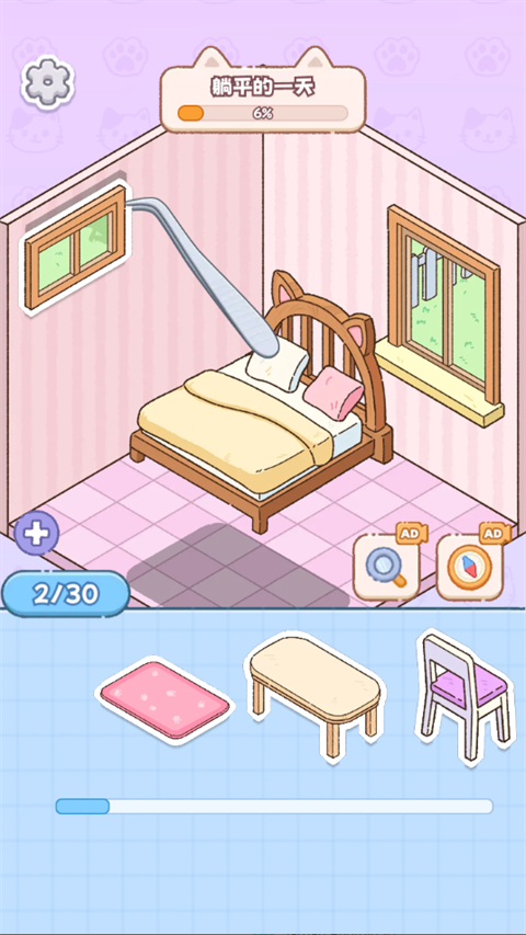 1、进入游戏后,拿起你的小镊子,把各种各样的家具和物品贴到它们该去的地方