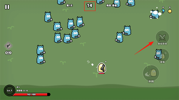 1、进入游戏操作页面,开启右侧的自动攻击模式,自动射击靠近的敌人,坚持到上方的时间倒计时结束即可胜利;