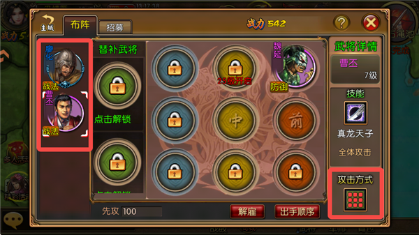 5、招募的武将显示在左方,点击武将可查看其技能信息以及攻击方式。