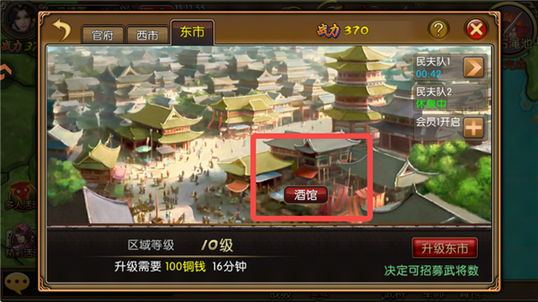2、进入【东市】,在酒馆中进行武将招募。