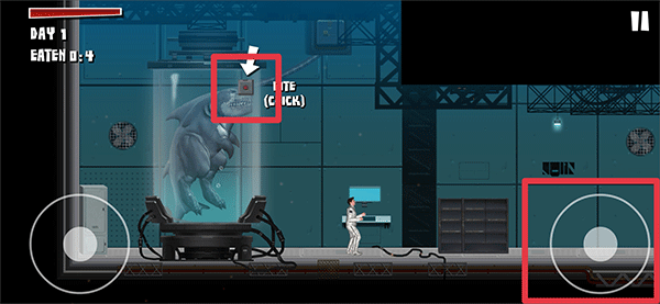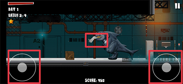 2、左边按钮上滑为跳跃、下滑为蹲下,然后通过左边按钮左右滑动控制鲨鱼前进,并点击右边按钮吃掉途中出现的人类