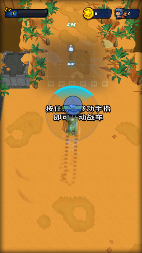 1、打开无敌小坦克游戏,通过虚拟控制杆操控坦克在地图上移动。