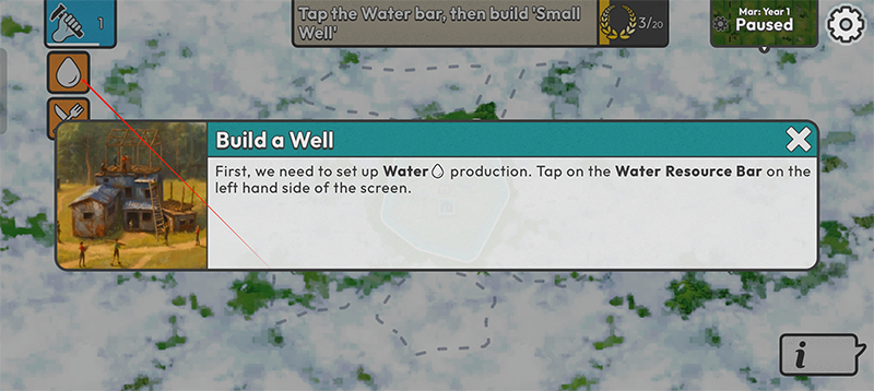 1、首先建造一口水井,点击屏幕左侧的水资源栏。