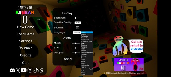 班班幼儿园0是一款让你在诡异幼儿园里被“小菜鸡”和“翡翠船长”追着跑的第一人称密室逃脱游戏,英文名字叫做:Garten of Banban 0。游戏中,你需要摸黑翻抽屉、找钥匙、躲柜子,刚破解一个谜题,转头就撞上那些五颜六色的怪物——它们虽然带着卡通感,但追你的时候照样吓得你手抖。环境压迫感十足,剧情层层剥开,每个角落都可能藏着下一个任务。中文设置藏得深,得手动去点“settings”。喜欢恐怖与可爱有反差的小伙伴可以试一试。