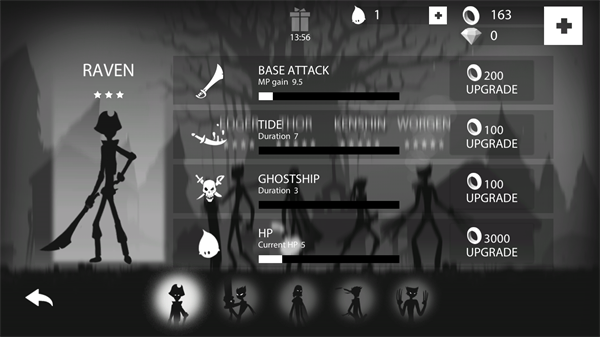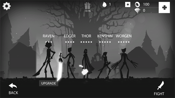 1、进入游戏后会出现五位不同的火柴人,除了第一位初始火柴人之外,剩余的需要利用金币和砖石来进行解锁,