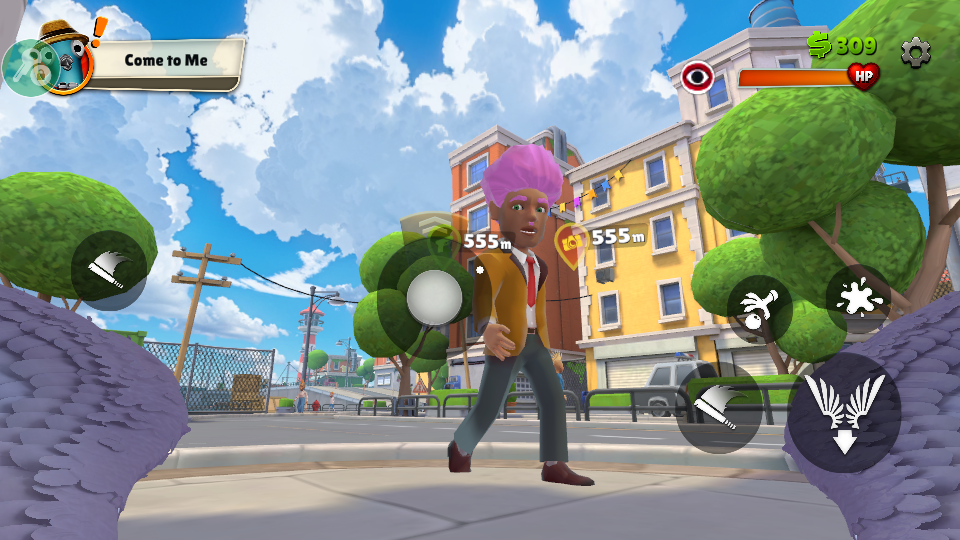 2、进入游戏,通过拖动左下角操纵杆来控制角色的移动方向;点击右下角翅膀图标,可以让角色飞起来;