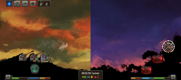 3、点击左上角的瞄准按键来瞄准敌方的炮台,可以三个炮台同时瞄准一个炮台,或者三个炮台同时瞄准一个炮台攻击;