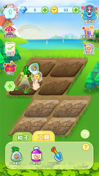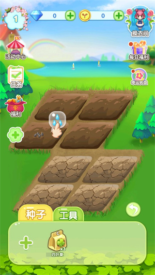 1、首先我们进入花花仙子的魔法花园游戏,刚进入游戏我们并没有什么服装,所以这个时候我们需要去种植解锁服装;