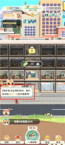 5、点击下方这个位置去张贴街头广告招点租客,并招募4名租客;