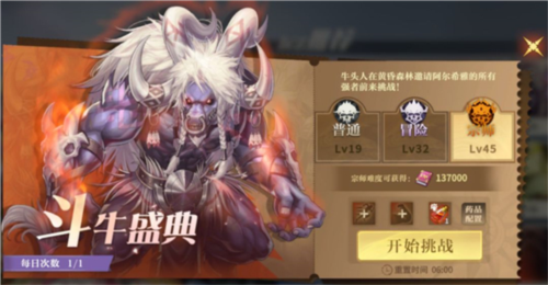 玩家角色等级达到19级解锁【斗牛盛典】玩法,通过击败【狂暴者雷萨】可获得经验,是新手期重要的经验来源。到达指定等级还将解锁不同的难度,通关可获得更多经验。