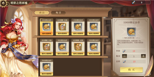 挑战暗影之塔获得的暗影兑换券,可以在【暗塔商城】内购买商品,通关相应层数就可以解锁更多商品的购买资格。