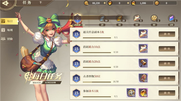 每日任务每天早上6:00刷新,完成任务可获得相应奖励。完成每日任务还能解锁活跃奖励。