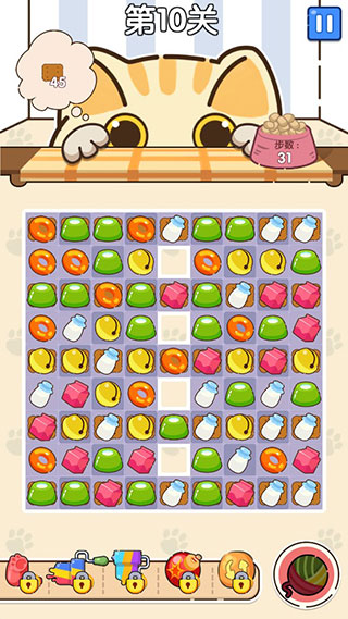 3、三消关卡精巧:基于经典消除机制,设计上千关卡,目标包括收集物品、清除障碍等,配合步数或时间限制提升策略性。